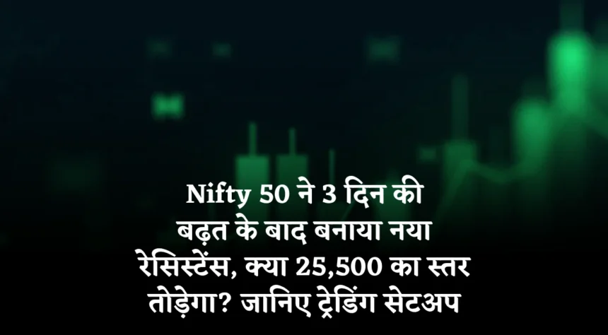 Nifty 50 ने सितंबर 18 को तीसरे लगातार सत्र में तेजी दिखाते हुए 25,400 के ऊपर बंद किया और 93 अंक की मजबूत बढ़त दर्ज की। यह उछाल मुख्य रूप से अमेरिकी Fed के फंड्स रेट कट के बाद आया, जिसने बाजार में तेजी के मूड को बढ़ावा दिया। फिलहाल बाजार के बीतते दिन में बुल्स का दबदबा साफ नजर आ रहा है, लेकिन विशेषज्ञों का मानना है कि अगले कदम से पहले कुछ कंसोलिडेशन (संघनन) भी देखने को मिल सकता है। Nifty 50 के लिए 25,500 का स्तर अब अगला बड़ा रेसिस्टेंस माना जा रहा है। यह वह जगह है जहां लंबी अवधि से चल रही गिरती हुई रेजिस्टेंस ट्रेंडलाइन मौजूद है। अगर बाजार इस स्तर को पार कर पाता है और उसे बनाए रख पाता है, तो जून के हाई 25,669 के रिटेस्ट का मार्ग खुल सकता है। लेकिन अगर इस स्तर को पार करने में विफल रहता है, तो 25,330 से 25,250 के बीच सपोर्ट जोन में कंसोलिडेशन देखने को मिल सकता है। तकनीकी रूप से देखें तो Nifty 50 ने एक छोटी Bearish Hanging Man कैन्डल बनाई है, जिसमें लंबी लोअर शैडो के साथ यह दर्शाता है कि निचले स्तरों पर खरीदारी मजबूत है। यह पैटर्न अपट्रेंड में रिवर्सल का संकेत दे सकता है, लेकिन इसके पुष्टि के लिए अगले सत्र की गतिविधि देखनी होगी। Relative Strength Index (RSI) 68.37 तक पहुंच गया है, जोकि मजबूती की ओर संकेत करता है, वहीं MACD ने बुलिश क्रॉसओवर बनाए रखा है और हिस्टोग्राम में भी ताकत बनी हुई है